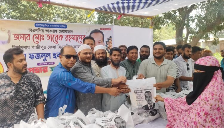 গাজীপুর মহানগরের পূবাইল থানাধীন করমতলা এলাকায় বিএনপির ভারপ্রাপ্ত চেয়ারম্যান তারেক রহমানের দিক নির্দেশনা অনুযায়ী পবিত্র ঈদুল ফিতর উপলক্ষে গাজীপুর জেলা বিএনপির আহ্বায়ক ফজলুল হক মিলন এর পক্ষ থেকে সাড়ে তিনশত দুস্থ অসহায় পরিবারের মাঝে ঈদ উপহার সামগ্রী বিতরণ করা হয়। শুক্রবার ২৮ মার্চ সকালে ৪২ নং ওয়ার্ডের ক্রিসেন্ট কেমিক্যাল সংলগ্ন মাঠে এ সকল ঈদ সামগ্রী বিতরণ করা হয়।উপহার সামগ্রীর মধ্যে ছিল,সেমাই, চিনি,গুড়াদুধ,পোলার চাউল,পেয়াচ আলু এবং শাড়ীকাপড়।ঈদ সামগ্রী বিতরণ অনুষ্ঠানে প্রধান অতিথি হিসেবে উপস্থিত ছিলেন,পূবাইল থানা বিএনপির সভাপতি মনির হোসেন সিকদার (বকুল)থানা বিএনপির সাধারণ সম্পাদক হারুনুর রশিদ সরকার,পূবাইল থানা বিএনপির প্রভাবশালী সদস্য সাখাওয়াত হোসেন খান খোকন খোকন,পূবাইল থানা বিএনপির যুগ্ম সম্পাদক হাজী মুনসুর আলী, থানা বিএনপির সাংগঠনিক সম্পাদক আরিফ হোসেন ভূঁইয়া, গাজীপুর মহানগর ছাত্রদলের সাবেক সহ-সভাপতি আবু সাঈদ সরকার,৪১ নং ওয়ার্ড বিএনপির সভাপতি আনোয়ার হোসেন দেওয়ান সাবেক পূবাইল ইউনিয়ন ছাত্রদলের সহ-সভাপতি আরিফ হোসেন দেওয়ান পূবাইল থানা ছাত্রদলের প্রতিষ্ঠাতা সভাপতি আজমিন খান সহ পূবাইল থানা বিএনপি ও সহযোগী সংগঠনের নেতাকর্মীরা এসময় উপস্থিত ছিলেন।