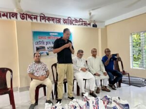 ত্রাণ সামগ্রী বিতরণকালে ক্লাব প্রেসিডেন্ট রোটারিয়ান এস এম জমির উদ্দিন বন্যা দুর্গতদের সহায়তায় সমাজের বিত্তবানদের এগিয়ে আসার উদাত্ত আহবান জানান।