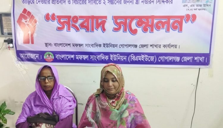 আজ শনিবার ১২ই জুলাই গোপালগঞ্জ মফস্বল সাংবাদিক ইউনিয়ন কার্যালয়ে এ সংবাদ সম্মেলন করেন নওরিন সিদ্দিকা, পিতা- শেখ দেলোয়ার হোসেন (অবসর সেনা সদস্য), দীঘলিয়া, রাধাগঞ্জ, কোটালীপাড়া। সংবাদ সম্মেলনে ভুক্তভোগী নওরিন বলেন, আমার স্বামী- এস, এম তাজ উদ্দিন, অর্থ মন্ত্রণালয়ের প্রশাসনিক কর্মকর্তা(এও) পিতা -আউয়াল সরদার, সিংগাতী মোল্লার হাট, বাগেরহাট। পরিবারিক ভাবে আমার বিবাহ হয় এস,এম তাজ উদ্দিনের সহিত ২০১০ সালের ১৩ই ফেব্রুয়ারি। আমি দুই ছেলে সন্তানের জননী আমার প্রথম ছেলে বয়াস ১৪ বছর ২য় ছেলের বয়াস ১০ বছর, বিবাহের ১ বছর পর থেকেই যৌতুকের দাবিতে আমার স্বামী তাজ উদ্দিন বিভিন্ন প্রক্রিয়া অবলম্বন করে আমাকে নির্যাতন শুরু করে। মেয়েদের জীবনে বিবাহ একবার হয় বলে সকল নির্যাতন আমি সহ্য করে স্বামীর সংসার করেছি। আমার স্বামী একজন নারী লোভী প্রকৃতির মানুষ, তার পরকীয়া আমার কাছে ধরা পড়ে যাওয়ায় আমি বাঁধা দেই। এর পর থেকেই শুরু হয় আমার উপর অমানবিক শারীরিক ও মানুষিক নির্যাতন। আমার স্বামীর নির্যাতনের করলে রক্তাক্ত অবস্থায় বার বার ঢাকা মেডিকেল ও গোপালগঞ্জ সদর হাসপাতালে ভর্তি হওয়ার বহু রেকর্ড আছে। বিগত আওয়ামী লীগ সরকারের আমলে আমার স্বামী তাজ উদ্দিন আর্থ মন্ত্রণালয়ে আওয়ামী রাজনীতির সাথে জড়িত ছিল। সে একজন সিবিএ নেতা ছিল। আমি বার বার তার অফিসে তার ঘৃণ্য এই কার্যকলাপের জন্য লিখিত আবেদন করেছি, কিন্তু তার ক্ষমতার কাছে তার অফিসও হার মেনেছে। তার অত্যাচার ও নির্যাতনের শিকার হয়ে আমি যাত্রাবাড়ি থানায় ও লালবাগ থানায় বহুবার অভিযোগ করেছি। থানা থেকে বার বার স্বরাষ্ট্রমন্ত্রীর সাথের ঘনিষ্ঠ সহচর জগন্নাথ বিশ্ববিদ্যালয়ে ভিপি শরিফুল ইসলাম শরিফ আমাকে ও আমার পরিবারকে ভয়ভীতি প্রদর্শন করে আমাদের লালবাগের সরকারি বাসায় পাঠিয়ে দিতো। বাসায় যাওয়ার পর আমার পাষণ্ড স্বামী আমাকে আবারো নির্যাতন করতো। ও আমার সাথে প্রতারণা করে আমার ২ ছেলেকে ঢাকা নিয়ে গেছে। আমার সাথে আমার সন্তানদের যোগাযোগ করতে দেয় না। ওর নামে অভিযোগ দিয়েও আমি কোনো প্রতিকার পাই নাই।