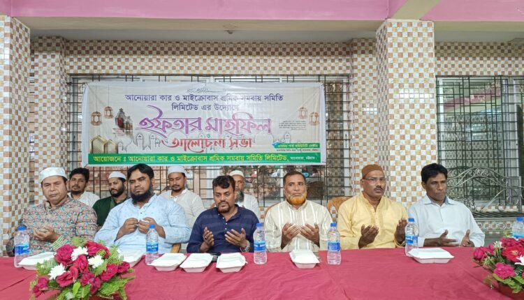বিশেষ অতিথির বক্তব্য রাখেন আনোয়ারা প্রেসক্লাবের সভাপতি এম.নুরুল ইসলাম। প্রধান আলোচক ছিলেন আনোয়ারা কার ও মাক্রোবাস সমবায় সমিতি লিঃ এর সাধারণ সম্পাদক দিদারুল আলম, সংগঠনের কোষাধ্যক্ষ মো লোকমান বক্তব্য রাখেন, শ্রমিক নেতাদের মাঝে মো.ইসমাইল, মো.জামাল, আবদুর রহিম,নুরুল আনোয়ার, মো.রুবেল, মো.ইব্রাহীম সহ সংগঠনের নেতৃবৃন্দরা। আলোচনা সভা শেষে ইফতার মাহফিলে তবারুক বিতরণ করা হয়। বিভিন্ন সামাজিক সংগঠনের নেতৃবৃন্দ ও পিএবি সড়কে চলাচল রত কার – মাইক্রো চালক ও সহকারীরা উপস্থিত ছিলেন।