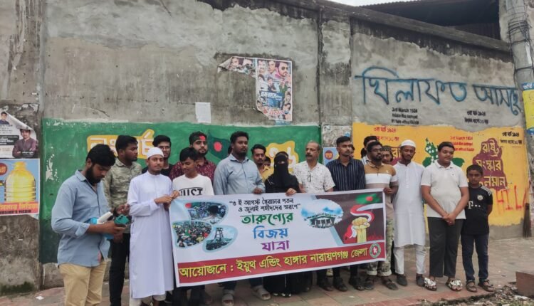 ৫ আগষ্ট ২০২৫, জুলাই গণঅভ্যুত্থানের ১ বছর পূর্তি উপলক্ষ্যে ইয়ুথ এন্ডিং হাঙ্গার নারায়ণগঞ্জ জেলার তারুণ্যের বিজয় যাত্রা অনুষ্ঠিত হয়েছে। নারায়ণগঞ্জের প্রাণকেন্দ্রে খানপুর হাসপাতাল মোড় থেকে পদযাত্রাটি শুরু হয়ে শহর প্রদক্ষিণ করে আবারও খানপুর হাসপাতাল মোড়ে এসে পদযাত্রাটি শেষ হয়। ইয়ুথ এন্ডিং হাঙ্গার নারায়ণগঞ্জ জেলার সমন্বয়কারী রাকিবুল ইসলাম ইফতি’র সভাপতিত্বে উক্ত আয়োজনে উপস্থিত ছিলেন সুশাসনের জন্য নাগরিক – সুজন, নারায়ণগঞ্জ জেলার সভাপতি ধীমান সাহা জুয়েল, দলিত নারী উন্নয়ন সংস্থা’র সভাপতি সনু রানী দাস, ইয়ুথ এন্ডিং হাঙ্গার নারায়ণগঞ্জ জেলার উপদেষ্টা মোহাম্মদ জারিফ অনন্ত, বুবলী যুব কল্যান সংস্থার সভাপতি বুবলী আক্তার, সাধারণ সম্পাদক সাদিয়া আফরিন তমা এবং ইয়ুথ এন্ডিং হাঙ্গার নারায়ণগঞ্জ জেলার বিভিন্ন ইউনিটের ইউনিট কো-অর্ডিনেটর এবং সদস্যগণ। পদযাত্রা শেষে একটি সংক্ষিপ্ত পথসভা অনুষ্ঠিত হয়। উক্ত পথসভায় বক্তারা বলেন জুলাই গণঅভ্যুত্থান মালিকানা এদেশের ছাত্র ও জনতা সবার। অভ্যুত্থানকালীন অনেক মানুষ স্বেচ্ছাসেবী হিসেবে কাজ করে গেছে, কিন্তু কোন প্রকার ক্রেডিটবাজি করার চেষ্টা করেনি। কিন্তু এই আমরা দেখতে পাচ্ছি এক শ্রেণির মানুষ আজ জুলাই অভ্যুত্থানের একক কৃতিত্ব দাবি করে বসে আছে। কিন্তু এই অভ্যুত্থানের কোন একক স্টেকহোল্ডার নেই, এই অভ্যুত্থানের স্টেকহোল্ডার আপামর জনসাধারণ। জনগণের অবদানকে অস্বীকার করার এই অপচেষ্টার জন্যই আমরা অভ্যুত্থান পরবর্তী কাঙ্ক্ষিত সাফল্য পাইনি, নতুন বাংলাদেশ গঠন করতে পারিনি। আমাদের প্রত্যাশা থাকবে এদেশের রাজনীতিবিদেদের সুবুদ্ধির উদয় হবে, তারা অভ্যুত্থানে জনগণের মালিকানাকে যোগ্য মূল্যায়ন করবে এবং জনগণও তাদের অভ্যুত্থানের ন্যায্য হিস্যা বুঝে নিবে এবং নতুন বাংলাদেশ বিনির্মানে অবদান রাখবে।