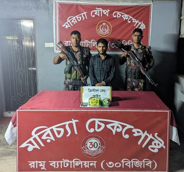 কক্সবাজারের উখিয়ার গোয়ালিয়া এলাকায় অভিযান চালিয়ে ১.৯৮০ কেজি ক্রিস্টাল মেথ আইসসহ একজনকে আটক করেছে বর্ডার গার্ড বাংলাদেশ (বিজিবি)।