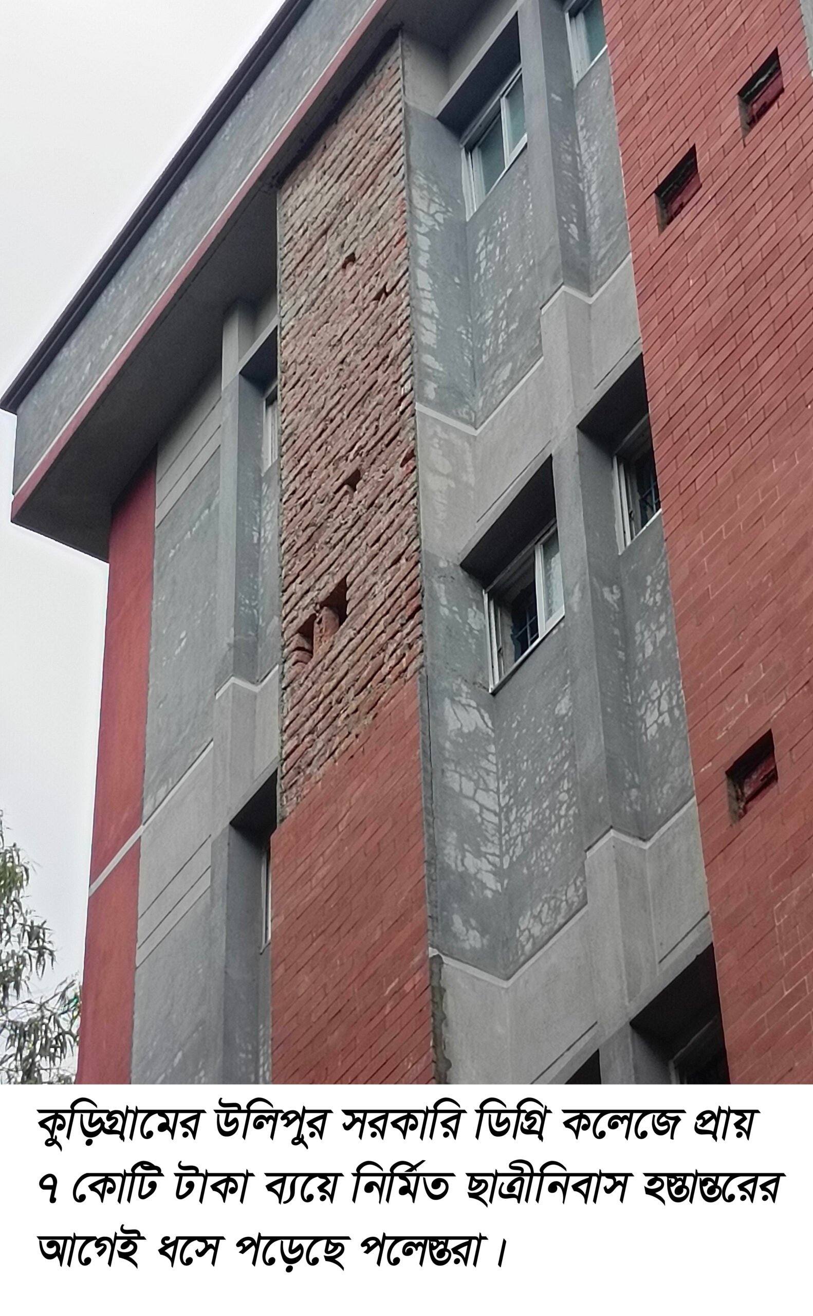 সরেজমিনে বুধবার (৩ জুলাই) উলিপুর সরকারি ডিগ্রি কলেজে গিয়ে দেখা যায়, ছাত্রী নিবাস ভবনটির কাজ প্রায় শেষ পর্যায়। কিন্তু হস্তান্তরের পূর্বেই পাঁচ তলা ভবনের দক্ষিন দিকের চতুর্থ ও পঞ্চম তলার বাহিরের দিকের একটি অংশের পলেস্তরা ধসে পড়েছে। এছাড়া পঞ্চম তলার পূর্ব দিকে পিছনের অংশে দেখা দিয়েছে ফাটল। ভবনের দরজা-জানালা, গ্রিলসহ বিভিন্ন জায়গায় নিম্নমানের সামগ্রি ব্যবহার করায় তা ব্যবহারের অনুপযোগি হয়ে পড়েছে।