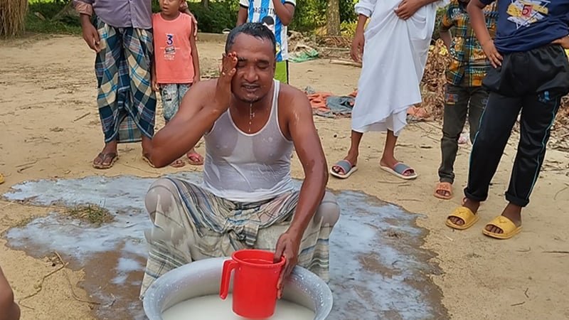 শেরপুরের নালিতাবাড়ীতে এনজিওর ঋণ থেকে মুক্ত হয়ে এক মণ দুধ দিয়ে গোসল করেছেন শহিদুল ইসলাম নামে যুবক।