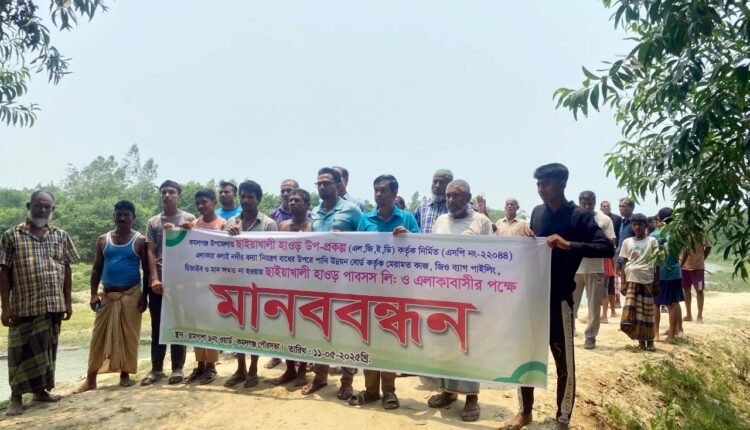 রবিবার (১১মে) দুপুর ১২টার দিকে এলাকাবাসীর আয়োজনে উপজেলার পৌর এলাকার ৯নং ওয়ার্ডে বাঁধ সংলগ্ন এলাকায় বাঁধ নির্মান, জিও ব্যাগ পাইলিংয়ের দাবীতে ছাইয়াখালী হাওড় (পাবসস) লি: ও এলাকাবাসীরা মানববন্ধন করেছে।