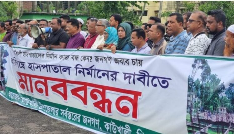 কাউখালী উপজেলা ৫০ শয্যা বিশিষ্ট হাসপাতালটি পূণ:নির্মানের দাবীতে কাউখালী উপজেলার সর্বস্তরের মানুষের ব্যানারে উপজেলা হাসপাতাল সড়কের সামনে ৪ জুন বুধবার সকাল ১০টায় মানব বন্ধন কর্মসূচি পালন করেন।