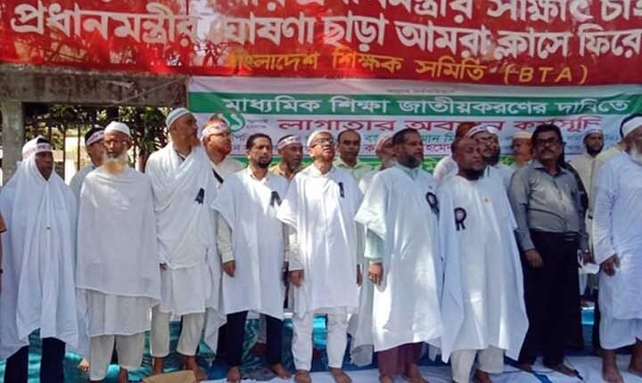 মাধ্যমিক শিক্ষাপ্রতিষ্ঠান জাতীয়করণের দাবিতে বেসরকারি শিক্ষকরা কাফনের কাপড় পরে আমরণ অনশন শুরু করেছেন।