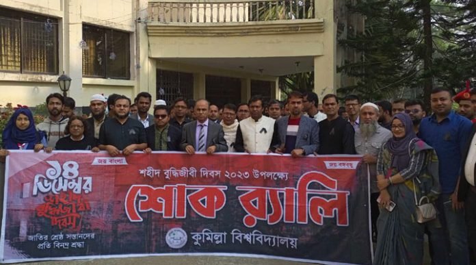 যথাযোগ্য মর্যাদায় কুমিল্লা বিশ্ববিদ্যালয়ে (কুবি) পালিত হয়েছে শহীদ বুদ্ধিজীবী দিবস। বৃহস্পতিবার (১৪ ডিসেম্বর) সকাল সাড়ে ১০ টায় কালো ব্যাজ ধারণ করে বিশ্ববিদ্যালয়ের প্রশাসনিক ভবনের সামনে থেকে শোক র্যালি শুরু হয়ে কেন্দ্রীয় শহীদ মিনারে গিয়ে শেষ হয়।