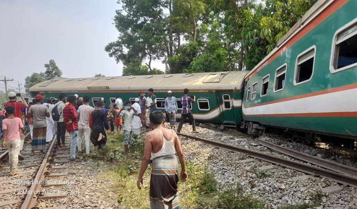 ঢাকা-চট্টগ্রাম রেলপথের কুমিল্লার নাঙ্গলকোট উপজেলার ঢালুয়া ইউনিয়নের তেজের বাজার সংলগ্ন এলাকায় চট্টগ্রাম থেকে জামালপুরগামী বিজয় এক্সপ্রেস ট্রেনের ৮টি বগি লাইনচ্যুত হয়েছে। রোববার (১৭ মার্চ) দুপুর দেড়টার দিকে এ দুর্ঘটনা ঘটে। দুর্ঘটনার বিষয়টি নিশ্চিত করেছেন নাঙ্গলকোট রেল স্টেশন মাস্টার জামাল হোসেন। তিনি বলেন, বগিগুলো ঢাকা-চট্টগ্রাম রেলপথের উভয় লাইনে ছড়িয়ে ছিটিয়ে থাকায় ঢাকা-চট্টগ্রাম, চট্টগ্রাাম-সিলেট, চট্টগ্রাম-চাঁদপুর, চট্টগ্রাম-জামালপুর রোডে ট্রেন চলাচল বন্ধ রয়েছে। হতাহতের বিষয়ে এখনো নিশ্চিত হওয়া যায়নি। স্থানীয়রা জানান, ট্রেনের ইঞ্জিনের সাথে থাকা লক ভেঙে এ দুর্ঘটনা ঘটে। প্রাথমিকভাবে দুর্ঘটনায় হতাহতের কোনো খবর জানা যায়নি। নাঙ্গলকোট উপজেলা নির্বাহী কর্মকর্তা ইসমাইল হোসেন বলেন, ঘটনাস্থলে আমাদের একাধিক পুলিশ এবং ফায়ার সার্ভিসের টিম গেছে। আমরা এটা নিয়ে কাজ করছি। দ্রুত রেল চলাচল স্বাভাবিক করতে আমরা চেষ্টা করছি।