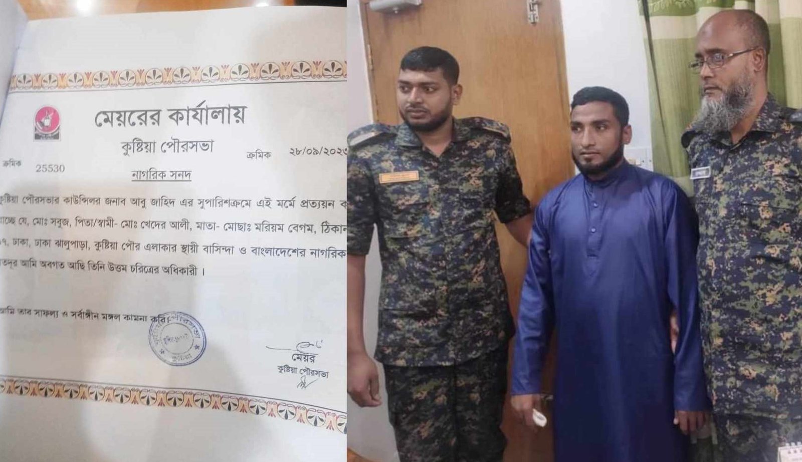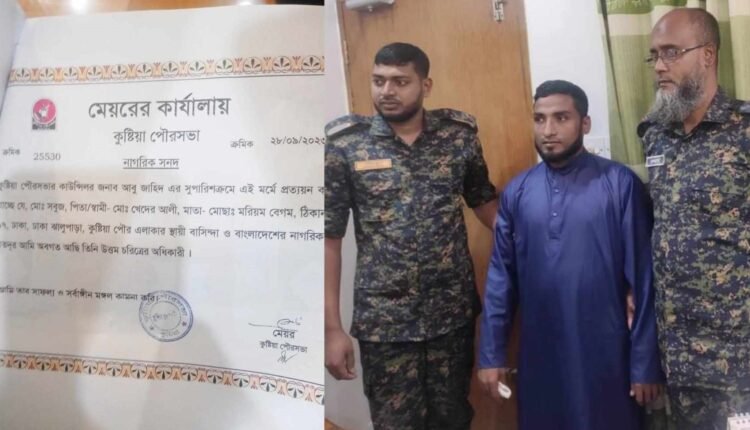 আটক মোঃ সবুজ,কুষ্টিয়া পৌর ১৭নং ওয়ার্ড ঢাকা ঝালুপাড়া গ্রামের ঠিকানা ব্যবহার করেছেন। এতে পিতার নাম মোঃ খেদের আলী ও মাতা মরিয়ম বেগম লিখেছেন এবং সেইসাথে কুষ্টিয়ার পৌর ১৬নং ওয়ার্ড কাউন্সিলর আবু জাহিদ সঞ্জুর সুপারিশক্রমে পৌরসভা থেকে নাগরিক সনদ প্রদান হয়।