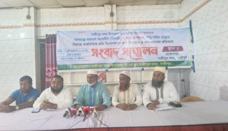 গাজীপুর সদর উপজেলা বিএনপি’র সাধারণ সম্পাদক আলহাজ্ব জয়নাল আবেদীন রিজভী ও দপ্তর সম্পাদক আবু সাইম মোল্লার বিরুদ্ধে মিথ্যা তথ্য দিয়ে অপপ্রচার করা হচ্ছে এমন অভিযোগ এনে সংবাদ সম্মেলন করা হয়েছে। বুধবার (১৬ অক্টোবর) দুপুরে গাজীপুর সদর উপজেলার হোতাপাড়া এলাকায় এই সংবাদ সম্মেলন অনুষ্ঠিত হয়। সংবাদ সম্মেলনে লিখিত বক্তব্যে গাজীপুর সদর উপজেলা বিএনপি’র সাধারণ সম্পাদক আলহাজ্ব জয়নাল আবেদীন রিজভী বলেন,আমি ছাত্র জীবন থেকে এখন পর্যন্ত স্বাধীনতার ঘোষক শহীদ রাষ্ট্রপতি জিয়াউর রহমানের আদর্শ লালন করে রাজনীতি করে আসছি। ফ্যাসিস্ট আওয়ামীলীগ সরকারের সময়ে হামলা,মামলা ও নির্যাতনেও আমাকে টলাতে পারেনি। সম্প্রতি গাজীপুর সদর উপজেলায় অবস্থিত পলমল গার্মেন্টস নিয়ে আমাদের হেয়প্রতিপন্ন করতেই আমাদের জড়িয়ে পরাজিত শক্তি ও তাদের দোসররা সাংবাদিকদের ভুল তথ্য দিয়ে সংবাদ প্রকাশ করে তা সামাজিক যোগাযোগ মাধ্যমে ছড়িয়ে দেয়। মূলত বিশৃঙ্খলার দায়ে পলমল গার্মেন্টস তাদের কিছু শ্রমিককে ছাটাই করে পরে ১৪ অক্টোবর শ্রম আইন অনুযায়ী ছাটাই করা শ্রমিকদের অর্থ পরিশোধের অনুষ্ঠানে উপজেলা বিএনপি’র পক্ষ থেকে আমাকে আমন্ত্রণ জানানো হয়। সে অনুষ্ঠানে আমি উপস্থিত থাকি এবং কারখানার উর্ধ্বতন কর্মকর্তাদের উপস্থিতে অত্যন্ত সুষ্ঠু পরিবেশে সেখানে শ্রমিকদের প্রাপ্য ন্যায্য অর্থ প্রদান করা হয়। পরে আমি অনুষ্ঠান স্থল থেকে চলে আসার পর শোনেছি শ্রমিক নেতা পরিচয়ে প্রতারক চক্র শ্রমিকদের কাছ থেকে তাদের বেতনের একটি অংশ নিয়ে নেয়। মূলত এই ঘটনাকে কেন্দ্র করেই রাজনৈতিক স্বার্থ হাসিলের জন্য একটি স্বার্থান্বেষী মহল আমার বিরুদ্ধে অপপ্রচার চালায়। এই ঘটনায় শুধুমাত্র আমার বিরুদ্ধেই নয় বরং দল হিসেবে বাংলাদেশ জাতীয়তাবাদী দল বিএনপি’র ভাবমূর্তি নষ্ট করারও চেষ্টা করা হয়েছে। কোন শ্রমিক আমাদের বিরুদ্ধে কোন অভিযোগ করেনি শুধুমাত্র মনগড়া তথ্য দিয়েই রাজনৈতিক স্বার্থ হাসিলের উদ্দেশ্যে আমার বিরুদ্ধে সংবাদ প্রকাশ করা হয়েছে।