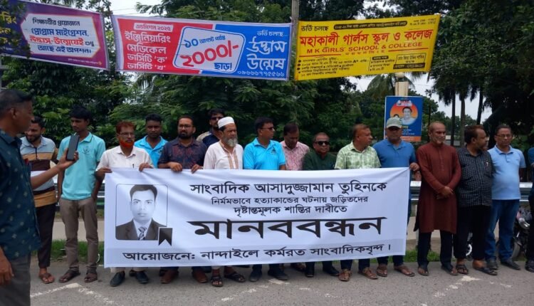 গাজীপুরে সন্ত্রাসীদের হাতে নিহত সাংবাদিক আসাদুজ্জামান তুহিন হত্যাকাণ্ডের প্রতিবাদে ও জড়িতদের দ্রুত গ্রেফতার এবং দৃষ্টান্তমূলক শাস্তির দাবিতে নান্দাইলের সাংবাদিক সমাজ মানববন্ধন কর্মসূচি পালন করেছে। শনিবার (৯ আগস্ট) দুপুর ১২টার দিকে নান্দাইল উপজেলা চত্বর সংলগ্ন ময়মনসিংহ–কিশোরগঞ্জ মহাসড়কে এ মানববন্ধন অনুষ্ঠিত হয়। মানববন্ধনে বক্তব্য রাখেন সিনিয়র সাংবাদিক এনামুল হক বাবুল, হান্নান মাহমুদ, আলম ফরাজি, বাবু অরবিন্দ পাল, মোখলেছুর রহমান ও জহিরুল ইসলাম লিটন। অনুষ্ঠানটি সঞ্চালনা করেন শামছ–ই–তাবারিজ রায়হান। বক্তারা বলেন, “সাংবাদিক তুহিন ছিলেন সত্য ও ন্যায়ের পক্ষে নির্ভীক কণ্ঠস্বর। তাঁর হত্যাকাণ্ড শুধু সাংবাদিক সমাজ নয়, সমগ্র জাতিকে শোকাহত করেছে। আমরা হত্যাকারীদের দ্রুত গ্রেফতার করে সর্বোচ্চ শাস্তি নিশ্চিত করার দাবি জানাচ্ছি।”