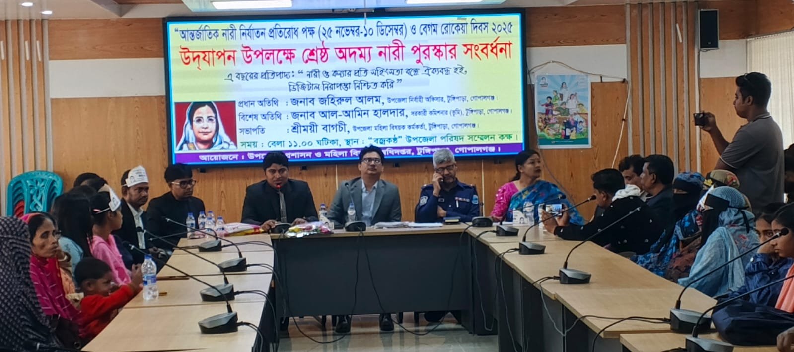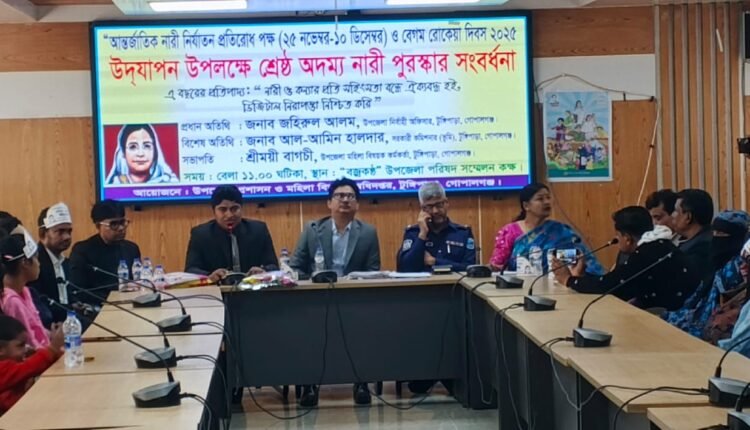 গোপালগঞ্জের টুঙ্গিপাড়া উপজেলায় আন্তর্জাতিক নারী নির্যাতন প্রতিরোধ পক্ষ (২৫ নভেম্বর–১০ ডিসেম্বর) এবং বেগম রোকেয়া দিবস-২০২৫ উপলক্ষে উপজেলা প্রশাসন ও মহিলা অধিদপ্তরের আয়োজনে অনুষ্ঠিত হয়েছে বর্ণাঢ্য র্যালি ও আলোচনা সভা। ৯ ডিসেম্বর সকাল ১১টায় উপজেলা চত্বর থেকে একটি সচেতনতামূলক র্যালি বের করা হয়। র্যালিটি টুঙ্গিপাড়া উপজেলার বিভিন্ন গুরুত্বপূর্ণ সড়ক প্রদক্ষিণ করে। পরে উপজেলা বজ্র কন্ঠ হল রুমে আলোচনা সভা অনুষ্ঠিত হয়। আলোচনা সভায় প্রধান অতিথি হিসেবে অংশগ্রহণ করেন উপজেলা নির্বাহী কর্মকর্তা (ইউএনও) জহিরুল আলম , বিশেষ অতিথি,সহকারি কমিশনার (ভূমি) জনাব আল আমিন হালদার ও,টুঙ্গিপাড়া থানার অফিসার্স ইনচার্জ জনাব আইয়ুব আলী, অনুষ্ঠানের সভাপতিত্ব করেন,উপজেলা মহিলা বিষয়ক কর্মকর্তা, শ্রীময়ী বাগচী, এছাড়াও বিভিন্ন দপ্তরের সরকারি কর্মকর্তা, শিক্ষক, শিক্ষার্থী এবং নারী উন্নয়ন সংস্থার প্রতিনিধিরা উপস্থিত ছিলেন। এবারের নারী নির্যাতন প্রতিরোধ পক্ষের প্রতিপাদ্য ছিল”নারী ও কন্যার প্রতি সহিংসতা বন্ধে ঐক্যবদ্ধ হই, ডিজিটাল নিরাপত্তা নিশ্চিত করি।”এই প্রতিপাদ্য সামনে রেখে নারী অধিকার, ডিজিটাল নিরাপত্তা ও নারীদের সামাজিক অবস্থান নিয়ে আলোচনা সভায় গুরুত্বারোপ করা হয়। এ বছর শ্রেষ্ঠ জয়িতা হিসেবে পুরস্কারে পুরুস্কৃত হন উপজেলার পাটগাতি বাজারের গার্মেন্টস ব্যবসায়ী পূর্ণিমারানী। আলোচনা সভায় প্রধান অতিথির বক্তব্যে ইউএনও জহিরুল আলম বলেন, সমাজে নারীর নিরাপত্তা নিশ্চিত করা এখন সময়ের দাবি। পারিবারিক, সামাজিক কিংবা ডিজিটাল প্ল্যাটফর্ম কোথাও যেন নারী ও কন্যারা সহিংসতার শিকার না হয়, তা নিশ্চিত করতে হবে। ডিজিটাল নিরাপত্তার আওতায় নারী ও কন্যার প্রতি সাইবার অপরাধ প্রতিরোধ, সামাজিক সচেতনতা এবং আইনি সহায়তা প্রসারিত করার আহ্বান জানান।