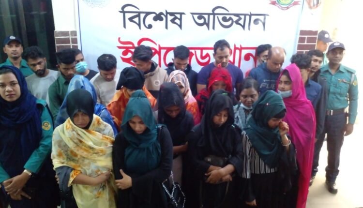 গ্রেফতারকৃতরা হলেন, মোঃ ইমরান নাজির (২৩), মোঃ মিজানুর রহমান (২৪), মোঃ আনোয়ারুল মিয়া (৩০), মোঃ সাজ্জাদ হোসেন (৩৯), মোঃ পারভেজ হোসেন (৩৫), মোঃ সুজন হাওলাদার (২৬), ছোটন কান্ত (২৮), সোহাগ হাওলাদার (২৯), মোঃ শাওন (২২), মোঃ বাবলু (৩৫), মোঃ রাজু আহম্মেদ (২৮), পরান সোনা চাকমা (৩৪), সুরমা আক্তার (২০), শিপা (২৩), আরশি আক্তার (১৯), শিউলী দাশ (৪০), সাবিনা আক্তার (২২), রেশমা (২২), মিম আক্তার (১৯), লিজা (৩২), জাহানারা আক্তার (২৩) ও সুমাইয়া আক্তার (২৩)।