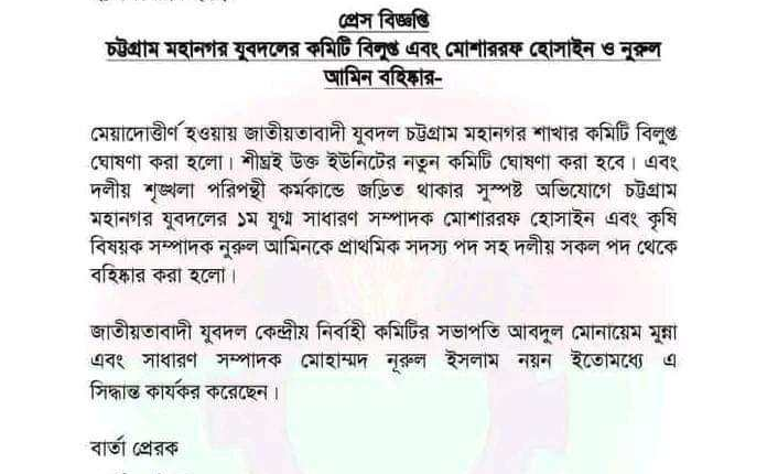 এতে আরও বলা হয়, দলীয় শৃঙ্খলা পরিপন্থি কর্মকাণ্ডে জড়িত থাকার সুস্পষ্ট অভিযোগে চট্টগ্রাম মহানগর যুবদলের প্রথম যুগ্ম সাধারণ সম্পাদক মোশাররফ হোসাইন এবং কৃষিবিষয়ক সম্পাদক নুরুল আমিনকে প্রাথমিক সদস্যপদসহ দলীয় সকল পদ থেকে বহিষ্কার করা হলো।