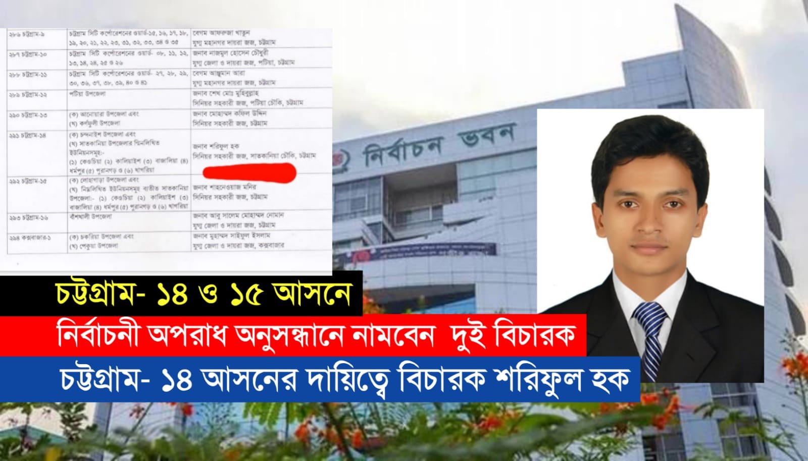 চট্টগ্রাম-১৪ ও ১৫ সংসদীয় আসনের নির্বাচনী অপরাধ অনুসন্ধান কমিটির দায়িত্ব দেয়া হয়েছে দুই বিচারককে।