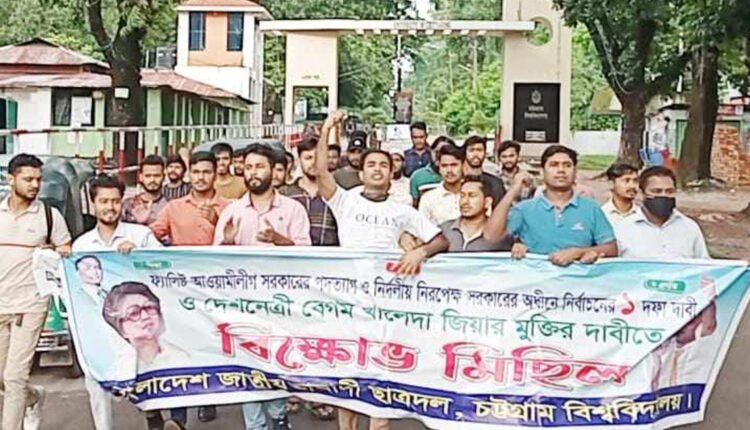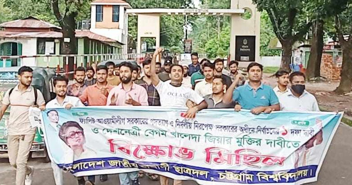 নির্দলীয় সরকারের অধীনে জাতীয় নির্বাচন এবং বিএনপি ও সমমনা রাজনৈতিক দলসমূহের ঘোষিত এক দফা দাবির সমর্থনে চট্টগ্রাম বিশ্ববিদ্যালয়ে (চবি) বিক্ষোভ মিছিল করেছে শাখা ছাত্রদল। মিছিলটি বিশ্ববিদ্যালয়ের কাটা পাহাড় থেকে জিরো পয়েন্ট অতিক্রম করে রেল স্টেশনে গিয়ে শেষ হয়।