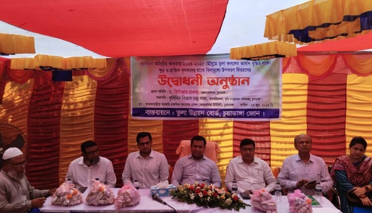 চুয়াডাঙ্গায় প্রণোদনা কর্মসূচির আওতায় ২০২৪-২৫ অর্থবছরের তুলা ফসলের আবাদ বৃদ্ধির লক্ষ্যে ক্ষুদ্র ও প্রান্তিক কৃষকদের মাঝে বিনামূল্যে উপকরণ বিতরণের শুভ উদ্বোধন করা হয়েছে।