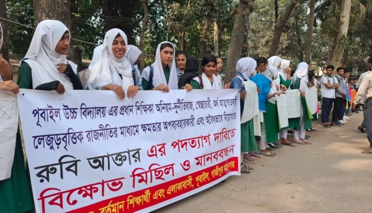 ছুটিতে থাকা প্রধান শিক্ষক রুবীর অপসারণ ও পদত্যাগ দাবিতে শিক্ষার্থীদের মানববন্ধন!