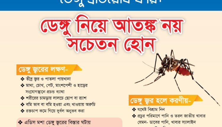 এডিশ মশা ডেঙ্গু জ্বরের বিস্তার ঘটায়, জমে থাকা পরিষ্কার পানিতে এডিস মশার জন্মায়, ডেঙ্গু প্রতিরোধে এডিস মশার বিস্তার রোধ এবং বাড়িতে এবং বাড়ির চারপাশে জলাবদ্ধতা রোধকরণ।