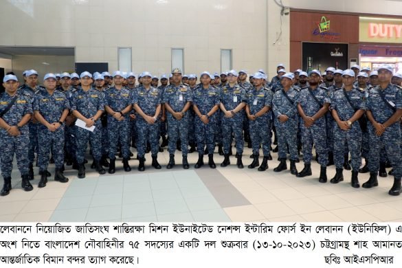 লেবাননে নিয়োজিত জাতিসংঘ শান্তিরক্ষা মিশন ইউনাইটেড নেশ›স ইন্টারিম ফোর্স ইনলেবানন (ইউনিফিল) এ অংশ নিতে বাংলাদেশ নৌবাহিনীর ৭৫ সদস্যের একটি দল গতকাল শুক্রবার শাহ আমানত আন্তর্জাতিক বিমান বন্দর ত্যাগ করেছেন। বাংলাদেশ নৌবাহিনী কন্টিনজেন্ট ‘ব্যানকন-১৪’ এর আওতায় লেবাননে মোতায়েনকৃত নৌবাহিনী যুদ্ধজাহাজ ‘সংগ্রাম’ এ এই নৌসদস্যগণ যোগদান করবেন। বিমান বন্দর ত্যাগকালে কমান্ডার চট্টগ্রাম নৌ অঞ্চলের চীফ স্টাফ অফিসার ক্যাপ্টেন মো. জামাল উদ্দিন চৌধুরী লেবাননগামী নৌ-সদস্যদের বিদায় জানান।