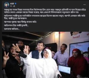 তিনি আরও লেখেন, অভিনন্দন গাজীপুরের নবনির্বাচিত নগরমাতা শ্রদ্ধেয় মিসেস জায়েদা খাতুন, আপনি একজন কাচকাটা হীরা, গাজীপুরের আম্মাজান।