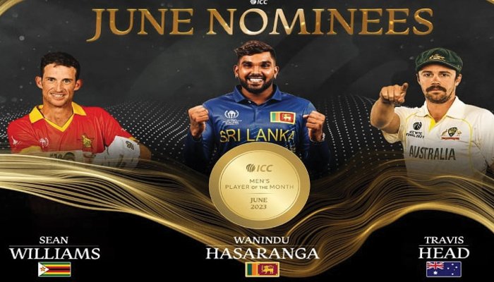 জুন মাসের সেরা খেলোয়াড়ের তালিকা প্রকাশ করেছে ইন্টারন্যাশনাল ক্রিকেট ক্রিকেট কাউন্সিল (আইসিসি)। ক্রিকেটের নিয়ন্ত্রক সংস্থার প্রকাশ করা তিনজনের সংক্ষিপ্ত তালিকায় জায়গা পেয়েছেন, জিম্বাবুয়ের অধিনায়ক শন উইলিয়ামস, শ্রীলঙ্কান অলরাউন্ডার ওয়ানিন্দু হাসারাঙ্গা ও অস্ট্রেলিয়ান ব্যাটার ট্র্যাভিস হেড।