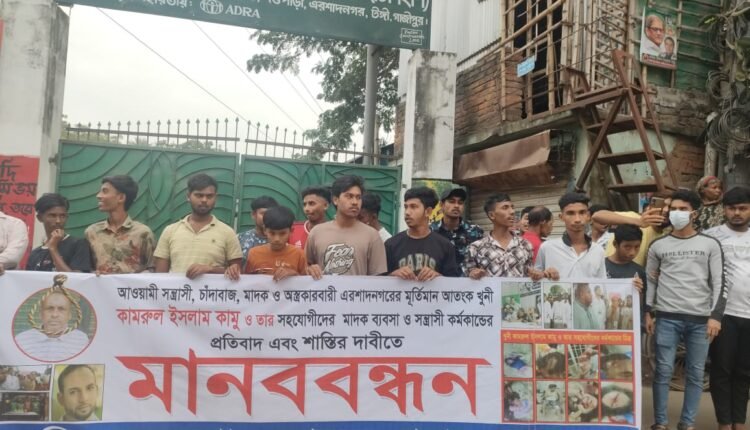গাজীপুরের টঙ্গীর এরশাদ নগর এলাকার সন্ত্রাসী, চাঁদাবাজ, মাদক কারবারী, অস্ত্রকারবারী একাধিক হত্যা মামলার আসামী কামরুল ইসলাম কামু ও তার সহযোগীদের সন্ত্রাসী কর্মকান্ডের প্রতিবাদে এবং দৃষ্টান্তমূলক শাস্তির দাবীতে মানববন্ধন বিক্ষোভ ও সংবাদ সম্মেলন করেছে ৪৯ নং ওয়ার্ড বিএনপি সহযোগী সংগঠন এবং এলাকাবাসী।