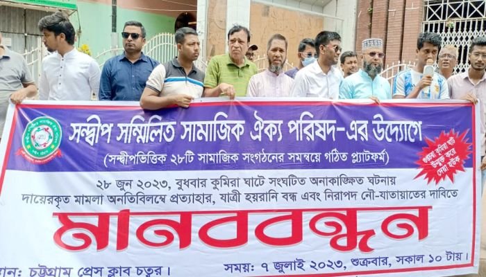 শুক্রবার (৭ জুলাই) সকাল ১০টার সময় সন্দ্বীপ সম্মিলিত ঐক্য পরিষদের প্রধান উপদেষ্টা অধ্যক্ষ মুকতাদের আজাদ খানের সভাপতিত্বে চট্টগ্রাম প্রেস ক্লাব চত্ত্বরে এ মানববন্ধন ও প্রতিবাদ কর্মসূচি অনুষ্ঠিত হয়।