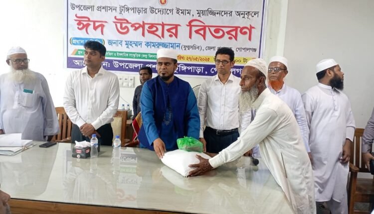 গোপালগঞ্জের টুঙ্গিপাড়া উপজেলায় উপজেলা প্রশাসনের ব্যতিক্রমী উদ্যোগে পবিত্র ঈদুল ফিতর উপলক্ষে ইমাম ও মুয়াজ্জিনদের মাঝে ঈদ উপহার সামগ্রী বিতরণ করা হয়েছে। মঙ্গলবার(২৭মে) দুপুর ১২টায় উপজেলা মডেল মসজিদ ও ইসলামিক সাংস্কৃতিক কেন্দ্র মিলনায়তনে এই ঈদ উপহার বিতরণ অনুষ্ঠান অনুষ্ঠিত হয়।