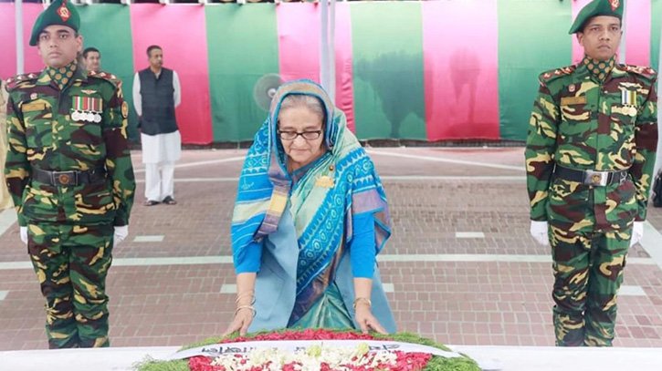 জাতির পিতা বঙ্গবন্ধু শেখ মুজিবুর রহমানের সমাধিতে গভীর শ্রদ্ধা নিবেদন ও দোয়া করেছেন প্রধানমন্ত্রী শেখ হাসিনা। বৃহস্পতিবার (৭ ডিসেম্বর) বিকালে ছোট বোন শেখ রেহানা ও পরিবারের সদস্যদের নিয়ে বঙ্গবন্ধুর সমাধিতে পুষ্পস্তবক অর্পণের মাধ্যমে শ্রদ্ধা নিবেদন করেন এবং ১৯৭৫ সালের ১৫ আগস্ট হত্যাকান্ডের শিকার বঙ্গবন্ধু ও অন্যান্য শহীদদের বিদেহী আত্মার চির শান্তি কামনা করে দোয়ায় যোগ দেন প্রধানমন্ত্রী। পুষ্পষ্পবক অর্পণের পর তিনি স্বাধীন বাংলাদেশের স্থপতির স্মৃতির প্রতি শ্রদ্ধা জানিয়ে কিছুক্ষণ নীরবে দাঁড়িয়ে থাকেন। আওয়ামী লীগ সভানেত্রী শেখ হাসিনা ব্যক্তিগত সফরে আজ দুপুরে পদ্মাসেতু হয়ে সড়কপথে গোপালগঞ্জের টুঙ্গিপাড়ায় পৈতৃক বাড়িতে পৌঁছেছেন। টুঙ্গিপাড়ার বাড়িতে রাত কাটিয়ে আগামীকাল তাঁর ঢাকার উদ্দেশে রওনা হওয়ার কথা রয়েছে।