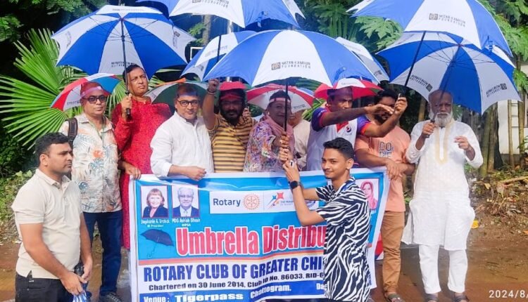 রোটারী ক্লাব গ্রেটার চিটাগং এর উদ্যোগে এবং এম কে ফাউন্ডেশনের সহযোগিতায় সোমবার নগরীর টাইগার পাস ও ষোলশহর ২নং গেইট এলাকায় ট্রাফিকের দায়িত্ব পালনকারী তিন শতাধিক শিক্ষার্থী, ট্রাফিক পুলিশ ও আনসার সদস্যদের মাঝে ছাতা বিতরণ করা হয়েছে।