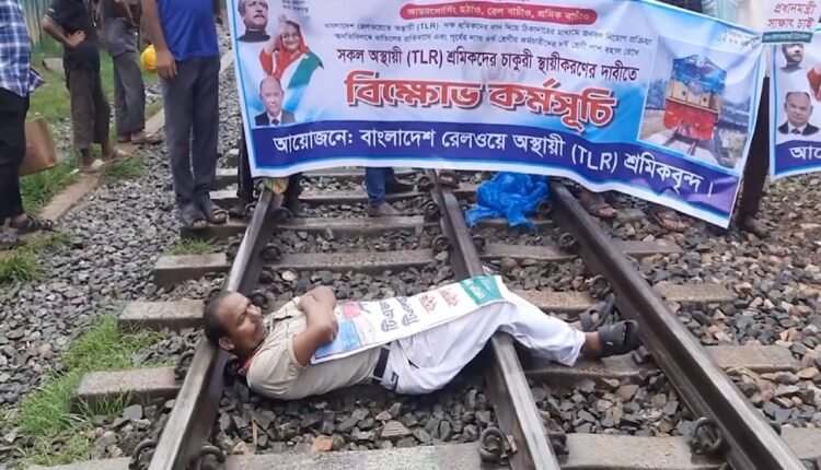 চাকরি স্থায়ীকরণের দাবি ও আউটসোর্সিংয়ের প্রতিবাদে রাজধানীর এফডিসি সিগন্যালে রেললাইন অবরোধ করে আন্দোলন করছেন রেলওয়ের অস্থায়ী শ্রমিকরা। এর ফলে ঢাকার সঙ্গে সারাদেশের রেল-যোগাযোগ বন্ধ রয়েছে।