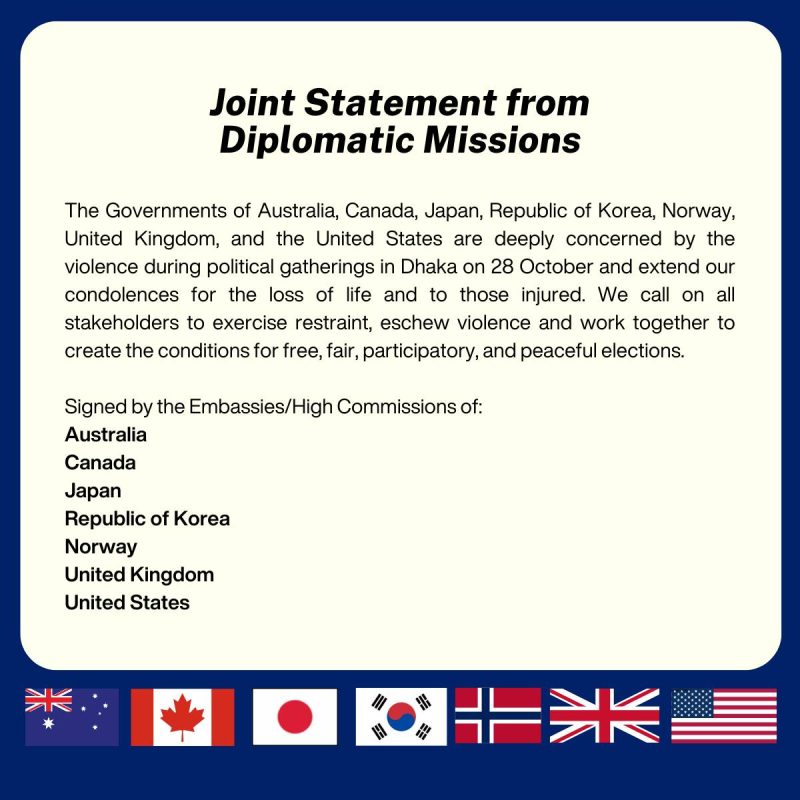 বিবৃতিতে বলা হয়: ২৮ অক্টোবর ঢাকায় রাজনৈতিক সমাবেশে যে সহিংসতা হয়েছে তাতে এসব দেশের সরকার গভীরভাবে উদ্বিগ্ন। এসব ঘটনায় নিহত ও আহত ব্যক্তিদের প্রতি তারা সমবেদনা জানায়।