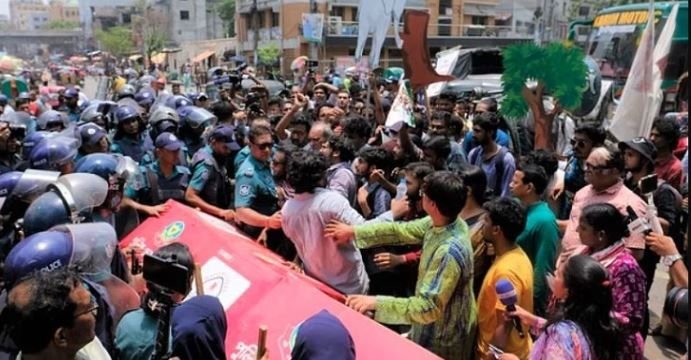 ঢাকা দক্ষিণ সিটি কর্পোরেশনের আওতাধীন সাত মসজিদ সড়কে সৌন্দর্যবর্ধনের নামে গাছ কাটার প্রতিবাদে নগর ভবন ঘেরাও করতে গেলে পুলিশের বাধার মুখে পড়ে আন্দোলনকারীরা।
