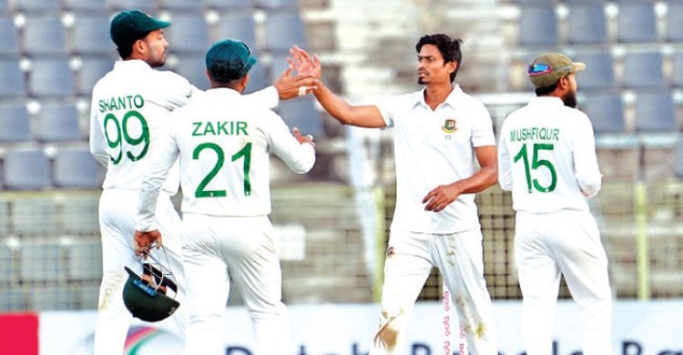 ২ ম্যাচ সিরিজের প্রথম টেস্টে জয়ের হাতছানি দেখা দিচ্ছে বাংলাদেশকে। স্পিনারদের তোপের মুখে পড়ে ৭ উইকেট হারিয়েছে নিউজিল্যান্ড। শুরু থেকেই কিউইদের চেপে ধরেছেন তাইজুল ইসলাম, মেহেদি হাসান মিরাজ ও নাইম হাসান। তাইজুল তুলে নিয়েছেন ৪টি উইকেট। মেহেদি আর নাইম শিকার করেছেন ১টি করে উইকেট। সবশেষ কাইল জেমিসনকে এলবিডব্লিউ করে সাজঘরে ফিরিয়েছেন তাইজুল। ২৮ বলে ৮ রান করেন এই কিউই লোয়ার অর্ডার। এর আগে গ্লেন ফিলিপসকে এলবিডব্লিউ করেছেন ডানহাতি অফস্পিনার নাইম। এই কিউই ব্যাটার করেছেন ২৬ বলে ১২ রান। জয়ের জন্য বাংলাদেশের দরকার আর ৩ উইকেট। অপরদিকে কিউইদের করতে হবে ২৩০ রান। শুরুতেই ৩ উইকেট হারানোর পর দলকে এগিয়ে নেওয়ার চেষ্টা করেন ওপেনার ডেভন কনওয়ে। দেখেশুনে খেলতে থাকেন এই কিউই ব্যাটার। শেষ পর্যন্ত তাকেও পিচে থাকতে দিলেন না অফস্পিনার তাইজুল ইসলাম। ৭৬ বলে ২২ করা এই ব্যাটারকে শাহাদাত হোসেনের ক্যাচ বানান বাঁহাতি স্পিনার। এরপর উইকেটরক্ষক ব্যাটার টম ব্লান্ডেলকেও সাজঘরে ফেরত পাঠান তাইজুল। ১৬ বলে ৬ রান করে শর্টলেগে নুরুল হাসানের হাতে ক্যাচ তুলে দেন এই কিউই ব্যাটার। এই প্রতিবেদন লেখা পর্যন্ত ৪৪ ওভারের খেলা শেষে কিউইদের সংগ্রহ ৭ উইকেটে ১০২ রান। ৪০ রান নিয়ে খেলছেন ড্যারেল মিচেল, অপরপ্রান্তে ০ রান নিয়ে অপরাজিত আছেন ইশ সোধি। এর আগে একে একে সাজঘরে ফিরেছেন ৩ কিউই টপঅর্ডার। ইনিংসের প্রথম ওভারের শেষ বলে রানের খাতা খোলার আগেই টম ল্যাথামকে (৬ বলে ০) সাজঘরে ফেরত পাঠান শরিফুল ইসলাম। এই বাঁহাতি পেসারের ফুল লেন্থের বলে উইকেটরক্ষক নুরুল হাসানের হাতে ক্যাচ তুলে দেন ল্যাথাম। প্রথম ইনিংসে বাংলাদেশ দলের কাঁটা হয়ে ব্যাট করছিলেন কেন উইলিয়ামসন। কিন্তু দ্বিতীয় ইনিংসে উইলিয়ামসনকে সেটি করতে দিলেন না তাইজুল ইসলাম। ইনিংসের শুরুর দিকেই এলবিডব্লিউয়ের ফাঁদে ফেলে এই কিউই ব্যাটারকে আউট করেন বাঁহাতি স্পিনার তাইজুল। ২৪ বলে ১১ রান করে সাজঘরে ফেরত যান উইলিয়ামসন। এরপর ব্যাট করতে নামা হেনরি নিকোলসে সাজঘরের পথ দেখান অফস্পিনার মেহেদি হাসান মিরাজ। ২ রানে করে নাইম হাসানের হাতে ক্যাচ দিয়ে সাজঘরে ফেরেন এই কিউই ব্যাটার। এর আগে ২ ম্যাচ সিরিজের প্রথম টেস্টে নিউজিল্যান্ডকে ৩৩২ রানের লক্ষ্য দিয়েছে বাংলাদেশ। আজ চতুর্থ দিনে ৭ উইকেটে ১২৬ রান করেছে বাংলাদেশ। এর আগে গতকাল দ্বিতীয় ইনিংসে ব্যাট করতে নেমে ৩ উইকেটে ২১২ রান করেছিল টাইগাররা। অধিনায়ক নাজমুল হোসেন শান্ত হাঁকিয়েছেন রেকর্ড গড়া সেঞ্চুরি। ফলে দ্বিতীয় ইনিংসে বাংলাদেশের মোট দাঁড়িয়েছে ৩৩৮ রান।এর আগে টস জিতে ব্যাট করতে নেমে প্রথম ইনিংসে ৩১০ রান করেছিল বাংলাদেশ। জবাবে ব্যাট করতে নেমে ৩১৭ রানে গিয়ে থামে নিউজিল্যান্ডের প্রথম 