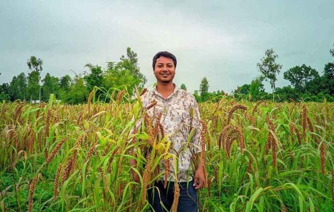 জেলার বীরগঞ্জ উপজেলার পল্লীতে চাষি রেজানুল ইসলাম রেজা বাদামের সাথে একই জমিতে কাউন চাষে সফলতা অর্জন করেছে।