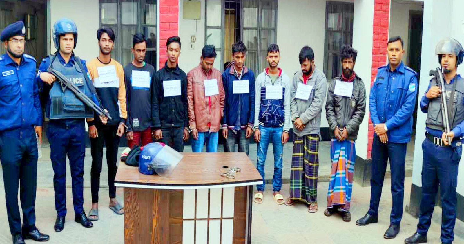 গ্রেপ্তারকৃত আসামীরা হলো, উপজেলার দক্ষিণ দেবীনগর এলাকার হানিফ চোকদারের ছেলে সুজন চোকদার (২০), একই এলাকার মোঃ জাহান আলী বেপারীর ছেলে পরশ ওরফে জাহিদ বেপারী (২৮), উত্তর দেবীনগর এলাকার মধু বেপারীর ছেলে সুরুজ মিয় ওরফে সরু (৩৪), কুলছুড়ি এলাকার দাদন চোকদারের ছেলে রাকিব চোকদার (২০), দক্ষিণ রাধানগর এলাকার শেখ লিটন এর ছেলে ইমন শেখ (২০), একই এলাকার শেখ লাল মিয়ার ছেলে বাচ্চু মিয়া (৩২), একই এলাকার বজলু বেপারীর ছেলে শাকিল বেপারী (২০), চরকুশাই এলাকার ছামছু চোকদারের ছেলে নাজমুল চোকদার (২৫)।