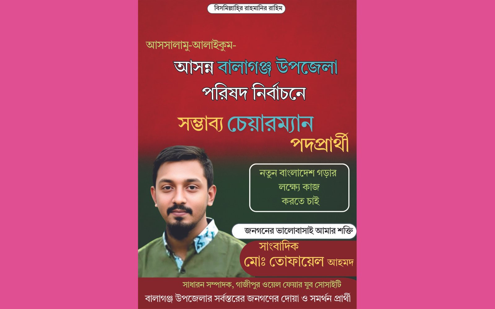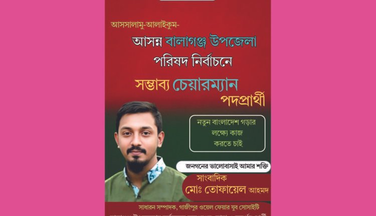 আসন্ন উপজেলা পরিষদ নির্বাচনকে ঘিরে সিলেট জেলার বালাগঞ্জ উপজেলায় রাজনৈতিক অঙ্গনে আলোচনা ক্রমেই জমে উঠছে। সম্ভাব্য চেয়ারম্যান প্রার্থীদের মধ্যে আলোচনার কেন্দ্রবিন্দুতে উঠে এসেছেন তরুণ সংবাদকর্মী, সমাজসেবক ও সংগঠক সাংবাদিক মোঃ তোফায়েল আহমেদ। তরুণ এই সমাজকর্মী শৈশব থেকেই মানবিক মূল্যবোধ ও মানুষের কল্যাণে কাজ করার মানসিকতার জন্য এলাকায় বিশেষভাবে পরিচিত। বিপদে-আপদে মানুষের পাশে দাঁড়ানো এবং সমাজের বিভিন্ন কল্যাণমূলক কর্মকাণ্ডে সক্রিয় অংশগ্রহণের মাধ্যমে তিনি ইতোমধ্যে সাধারণ মানুষের আস্থা অর্জন করেছেন।
