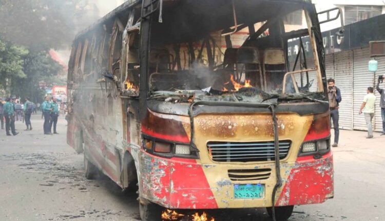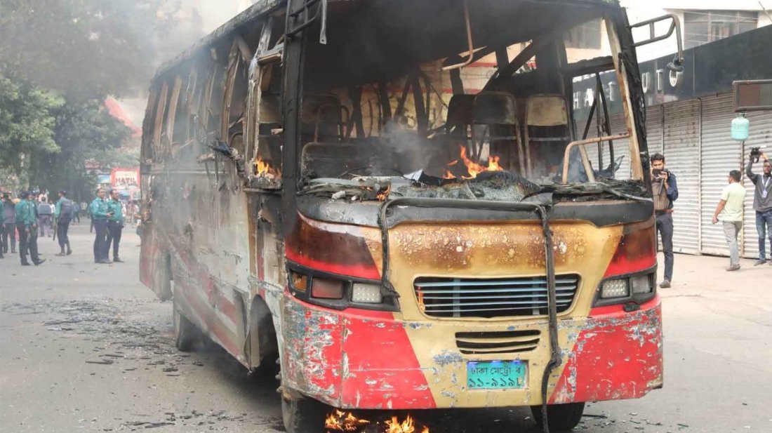 বিএনপির ও সমমনা দলগুলোর ডাকা ষষ্ঠ দফায় ৪৮ ঘণ্টার অবরোধ কর্মসূচি দ্বিতীয় দিনে রাজধানীর পল্টন এলাকার নাইটিঙ্গেল মোড়ে ‘আজমেরী’ পরিবহনের একটি যাত্রীবাহী বাসে আগুন দিয়েছে দুর্বৃত্তরা। বৃহস্পতিবার (২৩ নভেম্বর) দুপুর ১২টা ৫৩ মিনিটে এ ঘটনা ঘটে। ফায়ার সার্ভিসের দুটি ইউনিট আগুন নেভাতে কাজ করছে বলে জানান ফায়ার সার্ভিসের মিডিয়া কর্মকর্তা তালহা বিন জসীম। তিনি বলেন, ‘বাসে আগুন লাগার খবর পেয়ে সিদ্দিক বাজার ফায়ার স্টেশনের দুটি ইউনিট ঘটনাস্থলে গিয়েছে। অগ্নি নির্বাপণে কাজ চলছে। তবে এ ঘটনায় এখন পর্যন্ত কোনও হতাহতের খবর পাওয়া যায়নি।’