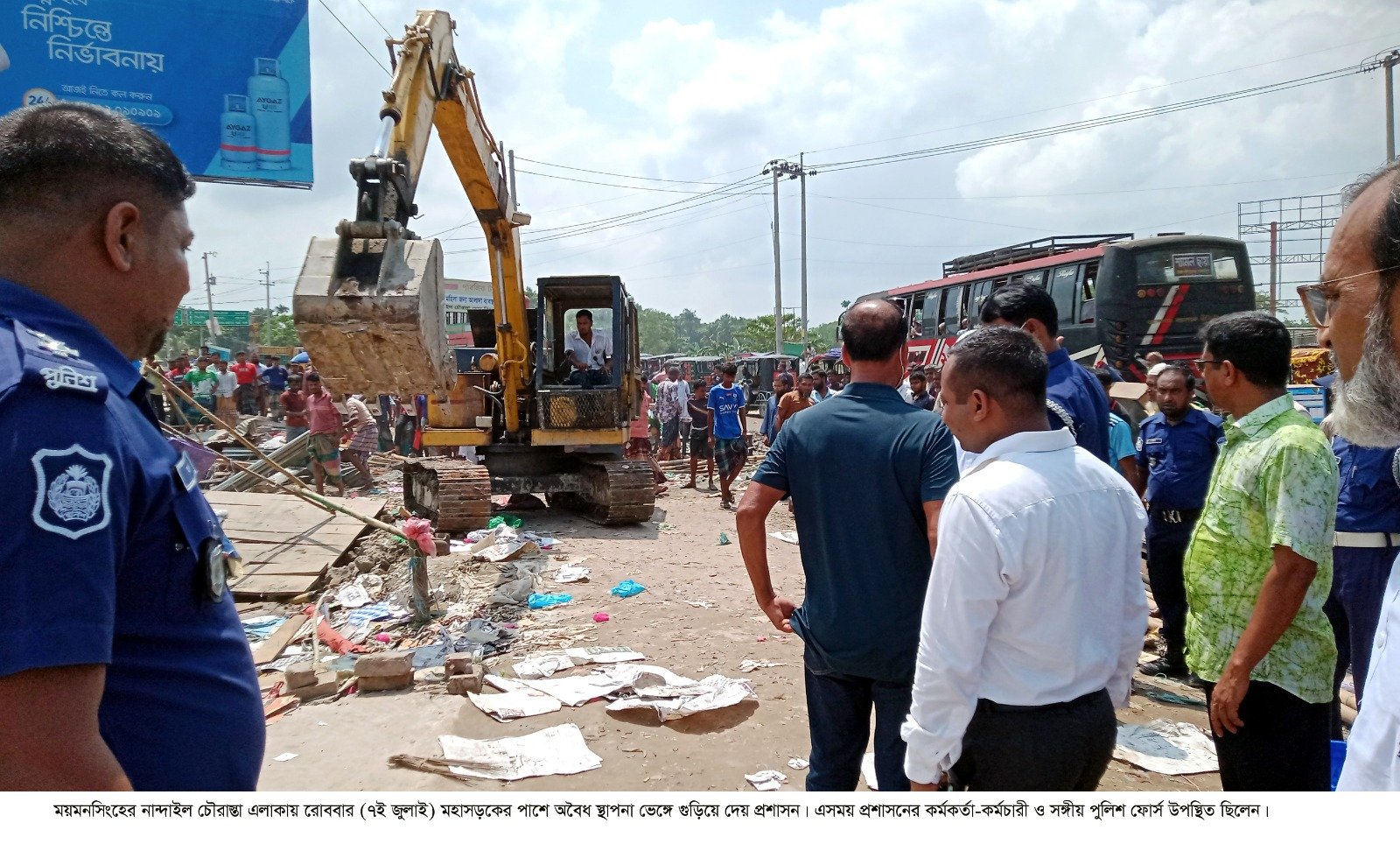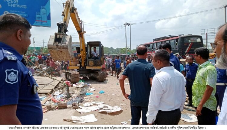 রোববার (৭ জুলাই) নান্দাইল উপজেলা প্রশাসন ও সংশ্লিষ্ট বিভাগের লোকজন সকাল ১১টা থেকে বিকাল ৩টা পর্যন্ত নান্দাইল চৌরাস্তায় মহাসড়কের কিশোরগঞ্জ মোড়, নান্দাইল মোড় ও কেন্দুয়া মোড়ের সকল অবৈধ স্থাপনা দোকানপাট ভেঙ্গে গুড়িয়ে দেন।