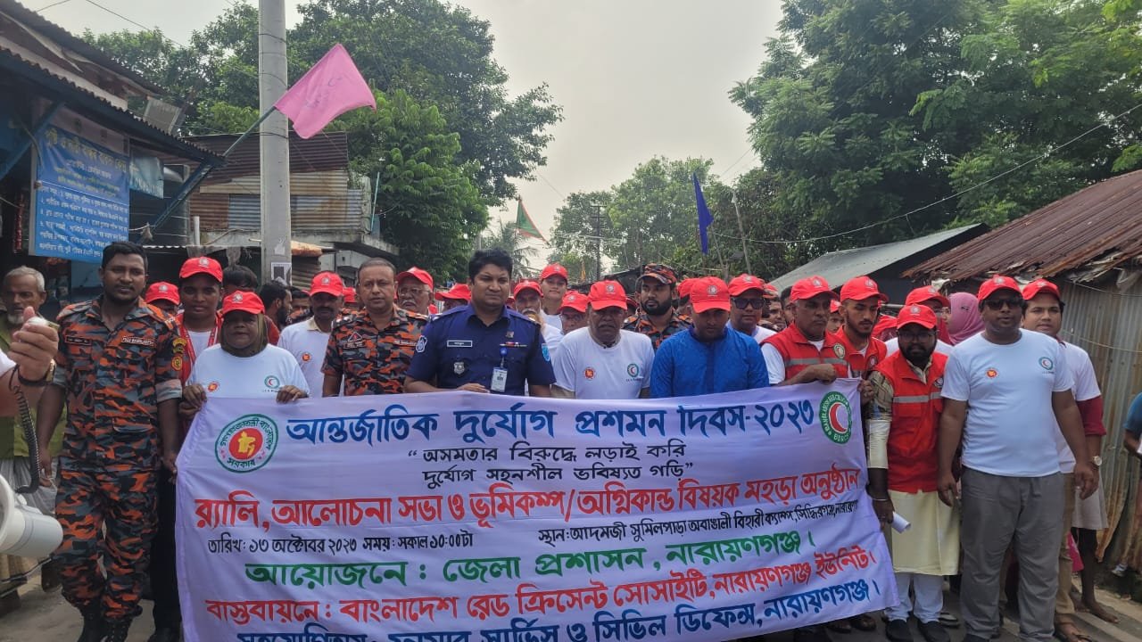 নারায়ণগঞ্জ প্রতিনিধি : অসমতার বিরুদ্ধে লড়াই করি, দুর্যোগ সহনশীল ভবিষ্যৎ গড়ি এ প্রতিপাদ্যে নারায়ণগঞ্জে আন্তর্জাতিক দুর্যোগ প্রশমন দিবস পালিত হয়েছে। দুর্যোগ ব্যবস্থাপনা অধিদপ্তরের ব্যবস্থাপনায় দিবসটি উপলক্ষে র্যালি ও আলোচনা সভা অনুষ্ঠিত হয়।