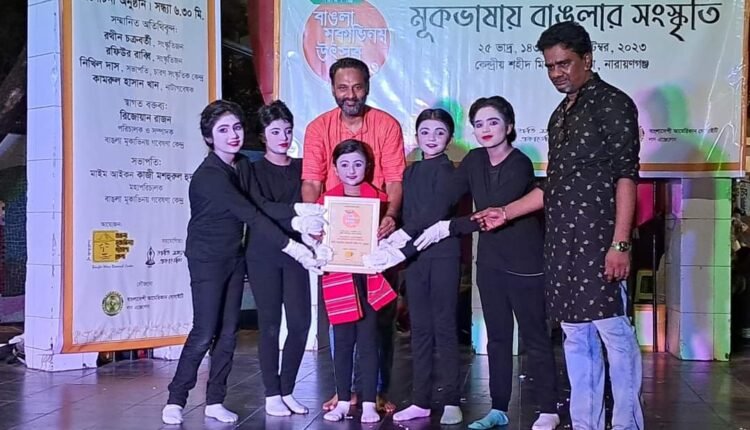 নারায়ণগঞ্জ প্রতিনিধি : বাঙলা মূকাভিনয় গবেষণা কেন্দ্রের আয়োজনে “মূক ভাষায় বাঙলার সংস্কৃতি” শিরোনামে অনুষ্ঠিত হল বাঙলা মূকাভিনয় উৎসব। শনিবার (৯ সেপ্টেম্বর) সন্ধা ৭টায় চাষাড়া কেন্দ্রীয় শহীদ মিনারের পাদদেশে অনুষ্ঠিত হয় বাঙলা মূকাভিনয় উৎসব। সাংস্কৃতিক সংগঠক ধীমান সাহা জুয়েলের সঞ্চালনায় উৎসবে উদ্বোধনী আলোচনা সভায় সভাপতিত্ব করেন সুদূর আমেরিকা থেকে স্কাইপিতে যুক্ত হয়ে মাইম আইকন কাজী মশহুরুল হুদা এবং স্বাগত বক্তব্য প্রদান করেন গবেষণা কেন্দ্রের পরিচালক ও সম্পাদক রিজোয়ান রাজন। অতিথি হিসাবে বক্তব্য প্রদান করেন প্রবীণ সংস্কৃতিজন রথীন চক্রবর্তী, আলোকিতজন রফিউর রাব্বি চারণ সংস্কৃতিক কেন্দ্রের সভাপতি নিখিল দাস, এবং নাট্যগবেষক মো. কামরুল হাসান, এই আয়োজনে নারায়ণগঞ্জ শ্রুতি সাংস্কৃতিক একাডেমির বৃক্ষলিপি ও রূপকথার দেশ, মাইম ফেইসের এডিকশন, মুন্সিগঞ্জ থিয়েটার সার্কেলের ফর মাই সেলফ, ঢাকার মনন মাইম থিয়েটারের হাঙরি এবং চট্টগ্রামের প্যান্টোমাইম মুভমেন্টের নদী, মাছ ও একজন হরিশংকর।বাঙলা মূকাভিনয় গবেষনা কেন্দ্র বাংলাদেশের মূকাভিনয় রীতি নির্মাণ, চর্চা, গবেষণা এবং শিল্পটিকে প্রান্তিক পর্যায়ে পৌঁছে দেওয়ার লক্ষ্যে দেশব্যাপী উদ্যোগ নিয়েছে এবং তা বাস্তবায়নে কার্যক্রম চালিয়ে যাচ্ছে। এরই ধারাবাহিকতায় দেশব্যাপী বিভাগ/জেলায় বাঙলা মূকাভিনয় উৎসবের আয়োজন চলেছে। নারায়ণগঞ্জ জেলা উৎসবে সহযোগিতা করছে শ্রুতি সাংস্কৃতিক একাডেমি এবং পৃষ্ঠপোষকতা করছে বাংলাদেশী আমেরিকান সোসাইটি, লসএঞ্জেলেস।