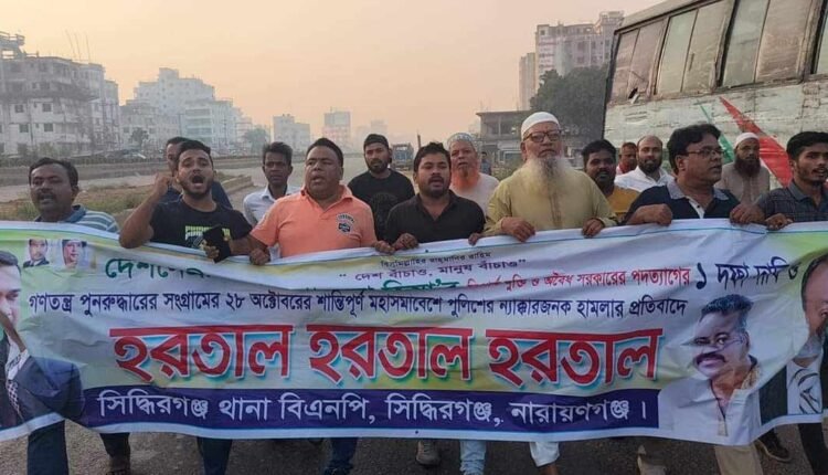 রোববার (২৯ অক্টোবর) ভোরে সাইনবোর্ডে মহাসড়কে হরতালের সমর্থনে মিছিল বের করে সিদ্ধিরগঞ্জ থানা বিএনপি। এসময় মিছিলের নেতৃত্বে ছিলেন থানা বিএনপির সভাপতি মাজেদুল ইসলাম ও সাধারণ সম্পাদক কাউন্সিলর ইকবাল। এসময় তাদেরকে গ্রেফতার করে পুলিশ। গ্রেফতারকৃতরা হলেন- সিদ্ধিরগঞ্জ থানা বিএনপি নেতা ফারুক, মোক্তার, জহিরসহ ৭ জন।