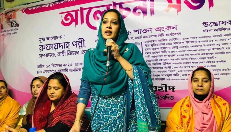 গত বুধবার (১৩ ডিসেম্বর) বিকাল ৩টায় নারায়ণগঞ্জ বন্দর একরামপুর সরকারি প্রাথমিক বিদ্যালয়ে এই আলোচনা সভা অনুষ্ঠিত হয়। বন্দর থানা হেযবুত তওহীদের নারী বিষয়ক সম্পাদক কিরণ ইসলাম এর সভাপতিত্বে উক্ত অনুষ্ঠানে মুখ্য আলোচক হিসেবে উপস্থিত ছিলেন হেযবুত তওহীদের কেন্দ্রীয় নারী সম্পাদক ও দৈনিক দেশের পত্র পত্রিকার সম্পাদক ও প্রকাশক রূফায়দাহ পন্নী। আলোচনা সভা অনুষ্ঠানে প্রধান অতিথি হিসেবে উপস্থিত ছিলেন নারায়ণগঞ্জ সিটি কর্পোরেশনের সংরক্ষিত ২২,২৩,২৪ নং ওয়ার্ডের কাউন্সিলর শাওন অংকন।