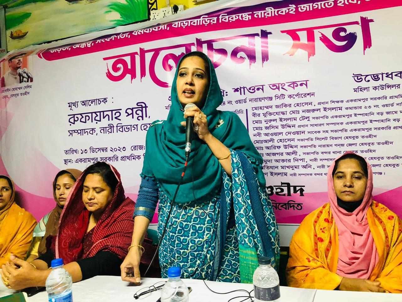 গত বুধবার (১৩ ডিসেম্বর) বিকাল ৩টায় নারায়ণগঞ্জ বন্দর একরামপুর সরকারি প্রাথমিক বিদ্যালয়ে এই আলোচনা সভা অনুষ্ঠিত হয়। বন্দর থানা হেযবুত তওহীদের নারী বিষয়ক সম্পাদক কিরণ ইসলাম এর সভাপতিত্বে উক্ত অনুষ্ঠানে মুখ্য আলোচক হিসেবে উপস্থিত ছিলেন হেযবুত তওহীদের কেন্দ্রীয় নারী সম্পাদক ও দৈনিক দেশের পত্র পত্রিকার সম্পাদক ও প্রকাশক রূফায়দাহ পন্নী। আলোচনা সভা অনুষ্ঠানে প্রধান অতিথি হিসেবে উপস্থিত ছিলেন নারায়ণগঞ্জ সিটি কর্পোরেশনের সংরক্ষিত ২২,২৩,২৪ নং ওয়ার্ডের কাউন্সিলর শাওন অংকন।