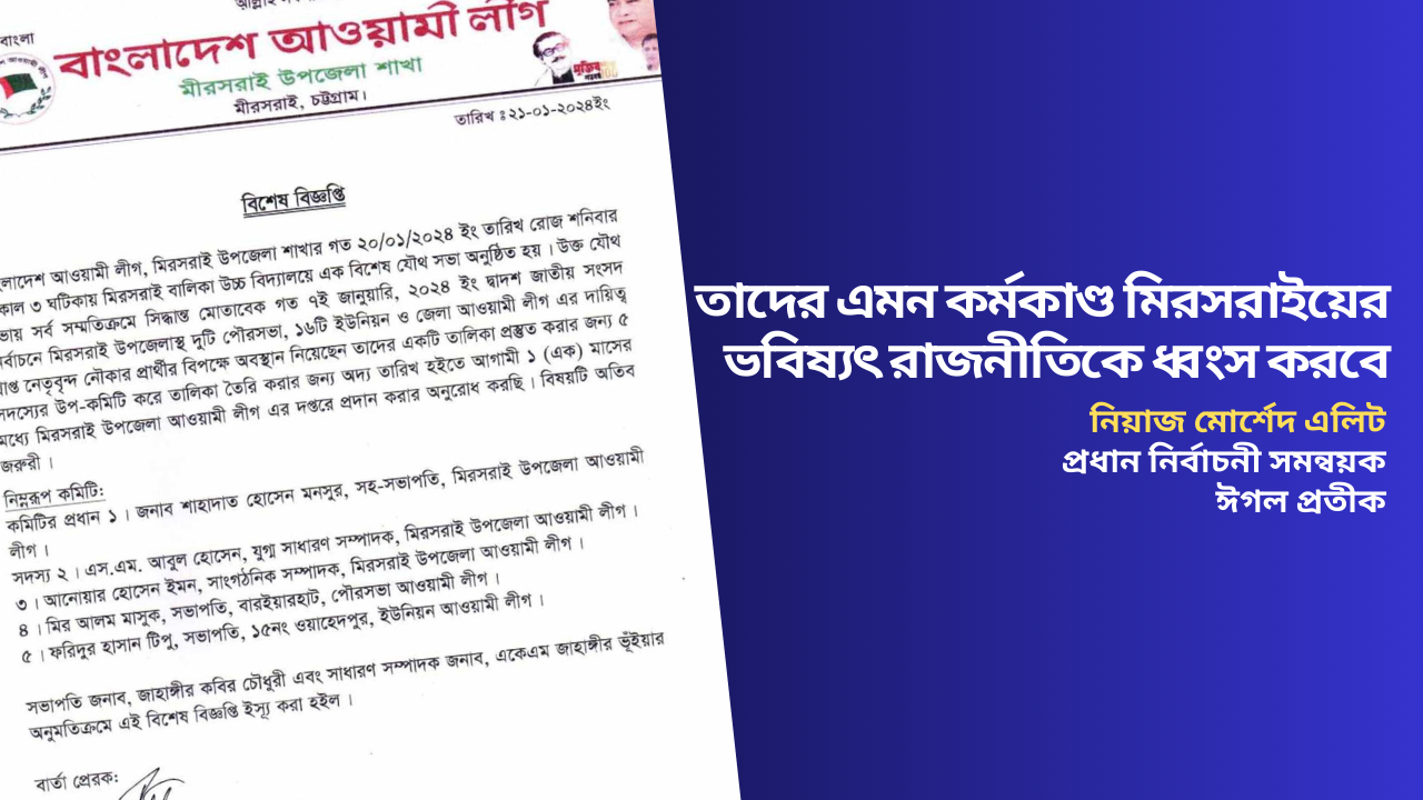 সোমবার (২২ জানুয়ারি) এই সংক্রান্ত একটি বিশেষ বিজ্ঞপ্তি প্রকাশ করে মিরসরাই উপজেলা আওয়ামী লীগ।