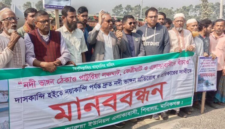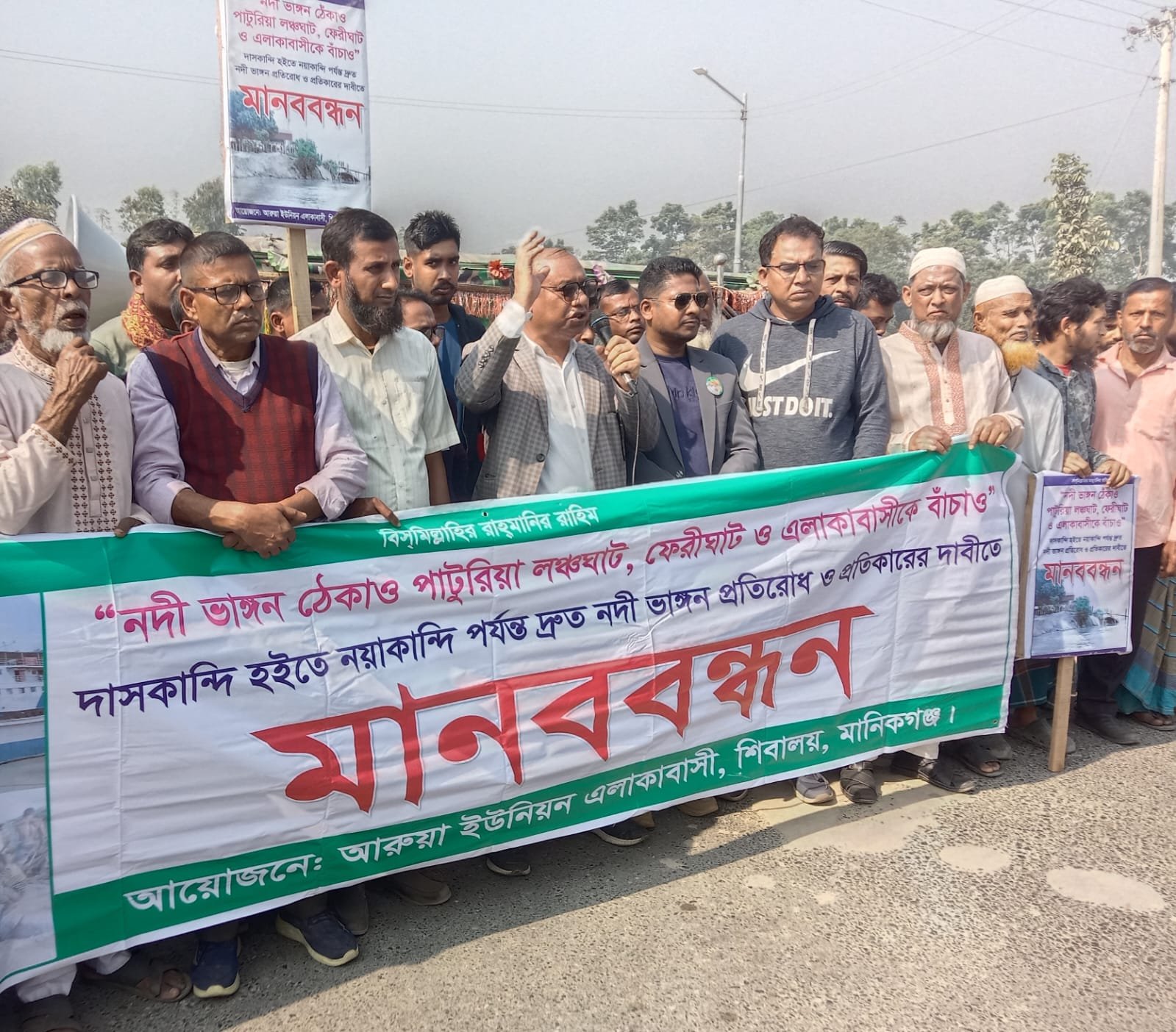 মানিকগঞ্জের শিবালয় উপজেলার আরুয়া ইউনিয়নের দাসকান্দি থেকে নয়াকান্দি পর্যন্ত এলাকায় ভয়াবহ নদী ভাঙ্গন প্রতিরোধ ও দ্রুত স্থায়ী প্রতিকারমূলক ব্যবস্থা গ্রহণের দাবিতে মানববন্ধন কর্মসূচি পালিত হয়েছে। “নদী ভাঙ্গন ঠেকাও, পাটুরিয়া লঞ্চঘাট, ফেরীঘাট ও এলাকাবাসীকে বাঁচাও” এই শ্লোগানকে সামনে রেখে ২৮-০১-২০২৬ ইং বুধবার সকাল ১০টায় পাটুরিয়া লঞ্চঘাট সংলগ্ন এলাকায় এ মানববন্ধন অনুষ্ঠিত হয়। মানববন্ধনের আয়োজন করে আরুয়া ইউনিয়ন এলাকাবাসী, শিবালয়, মানিকগঞ্জ। মানববন্ধনে অংশগ্রহণকারী এলাকাবাসী জানান, দীর্ঘদিন ধরে দাসকান্দি থেকে নয়াকান্দি পর্যন্ত পদ্মা নদীর তীব্র ভাঙ্গনের ফলে শত শত পরিবার বসতভিটা হারিয়ে নিঃস্ব হয়ে পড়েছে। নদী ভাঙ্গনের কারণে হুমকির মুখে রয়েছে গুরুত্বপূর্ণ পাটুরিয়া লঞ্চঘাট ও ফেরীঘাটসহ আশপাশের জনপদ।