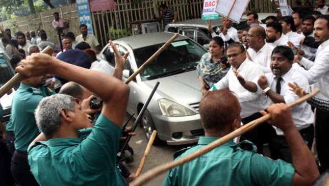 তখন মিছিলকারী আইনজীবীরা হট্টগোল সৃষ্টি করে সাধারণ মানুষের মাঝে ভয় ও আতঙ্ক সৃষ্টি করে কর্তব্যরত পুলিশের ওপর প্রথমে ইটপাটকেল নিক্ষেপ করেন এবং তাদের হাতে থাকা প্ল্যাকার্ডের লাঠি দিয়ে কর্তব্যরত পুলিশ সদস্যদের পিটিয়ে আহত করেন। এসময় পুলিশ সদস্যরা আত্মরক্ষার্থে এবং যান চলাচল ও সাধারণ মানুষের চলাচল স্বাভাবিক রাখাসহ আদালত প্রাঙ্গণ এলাকার আইনশৃঙ্খলা রক্ষার্থে মিছিলকারী আইনজীবীদের ছত্রভঙ্গ করে দেয়। এ ঘটনায় মিছিলকারী আইনজীবীদের নিক্ষিপ্ত ইটপাটকেল ও প্ল্যাকার্ডের লাঠির আঘাতে কোতোয়ালি জোনের এডিসি মুহিত কবির সেরনিয়াবাত, কোতোয়ালি থানার এসি শাহিনুর ইসলাম, ভারপ্রাপ্ত কর্মকর্তা (ওসি) শাহীনুর রহমান, ওসি অপারেশন নাজমুল হক, এএসআই বসির ও কনস্টেবল রুহুল আমিন, আনসার সদস্য সুমন আলী আহত হন।