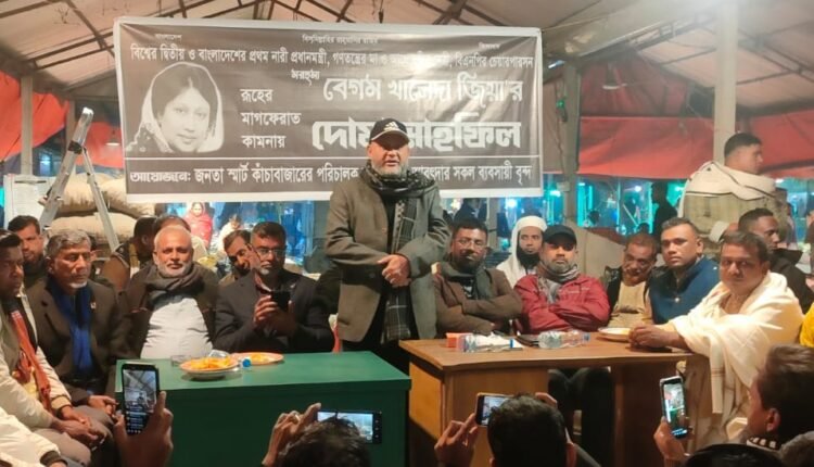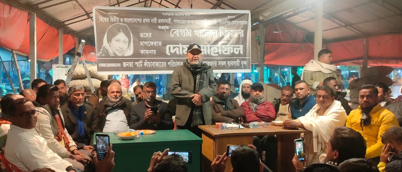 সাবেক প্রধানমন্ত্রী ও বিএনপির চেয়ারপারসন বেগম খালেদা জিয়ার রুহের মাগফিরাত কামনায় জনতা স্মার্ট বাজারের পরিচালক বৃন্দ ও আড়তদার ব্যাবসায়ীদের উদ্দোগে দোয়া মাহফিল অনুষ্ঠিত হয়েছে। রবিবার বাদ এশা গাজীপুর মহানগরীর ৪২নং ওয়ার্ড এর মিরের বাজার কামাড়গাও স্মার্ট কাঁচা বাজারে এই দোয়া মাহফিল অনুষ্ঠিত হয়। এসময় উপস্থিত ছিলেন পূবাইল থানা বিএনপি’র সভাপতি মনির হোসেন শিকদার বকুল, পূবাইল থানা বিএনপি’র সিনিয়র সহ সভাপতি দেলোয়ার হোসেন,, ৪২ নং ওয়ার্ড এর সাবেক কাউন্সিলর সুলতান উদ্দিন আহমেদ, পূবাইল থানা বিএনপির সিনিয়র যুগ্ম সাধারণ সম্পাদক জাকির হোসেন সরকার, জনতা স্মার্ট বাজারের চেয়ারম্যান কামাল হোসেন,পূবাইল থানা বিএনপির যুগ্ন সাধারণ সম্পাদক রাকিব মোল্লা,পূবাইল থানা বিএনপির ছাত্র বিষয়ক সম্পাদক ইঞ্জিনিয়ার আলম,পূবাইল থানা যুবদলের ১নং যুগ্ন আহবায়ক সোওরাব হোসেন,গাজীপুর মহানগর ছাত্র দলের সাবেক সহ-সভাপতি রাজীব ভূইয়াসহ পূবাইল থানা বিএনপির অঙ্গ ও সহযোগী সংগঠনের নেতবৃন্দ। এ সময় বেগম খালেদা জিয়ার রুহের মাগফিরাত ও জান্নাতুল ফেরদৌস নসিব কামনা করে বিশেষ মোনাজাত করা হয়। দোয়া শেষে মানুষের মাঝে রান্না করা খাবার বিতরণ করা হয়।